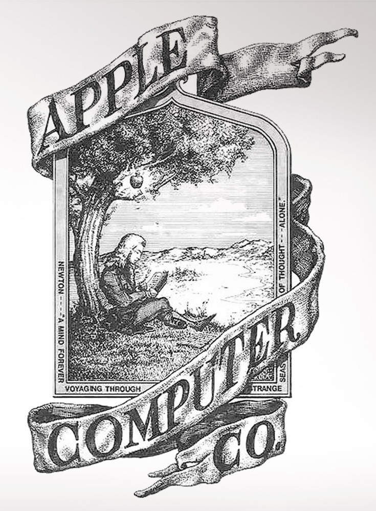 Το παλιό logo είχε το κείμενο «Apple Computer Co.» σε μια κορδέλα γύρω από μια εικόνα του Ισαάκ Νεύτωνα ο οποίος φαινόταν να κάθεται κάτω από ένα δέντρο, λίγο πριν... το μήλο πέσει στο κεφάλι του.